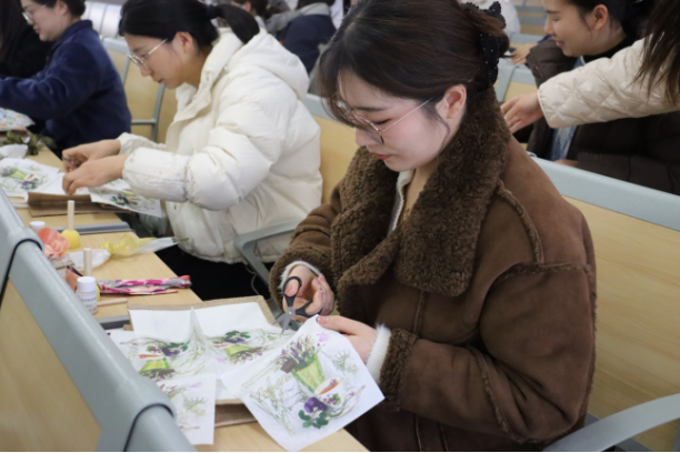 紧接着,备受期待的蝶古巴特帆布包DIY创作环节正式开启。蝶古巴特是一种源自法国的拼贴装饰艺术,通过剪裁、拼贴、上胶等步骤,将精美的图案赋予日常物品新的生命力。在工作人员的指导下,女员工们纷纷化身“艺术设计师”,挑选心仪的图案,细心剪裁,精心构图,再逐层刷胶固定。原本素净的帆布包,在大家的巧手下逐渐变得色彩斑斓、别具一格。活动现场欢声笑语不断,大家在创作中释放压力,在交流中增进情谊。